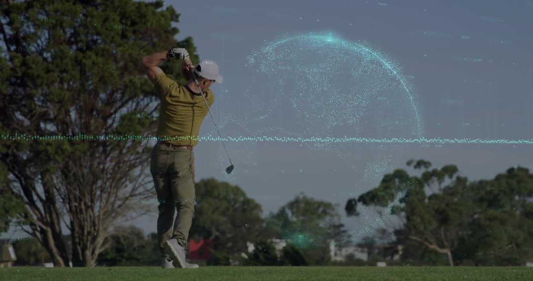 This video showcases a golfer mid-swing on a green fairway with a futuristic, digital overlay of a rotating globe and streaming data. It reflects the integration of technology in sports, combining physical activity with digital innovation. Suitable for articles on tech enhancements in sports, leisure magazines, advertising campaigns highlighting advancements in golfing tech, or lifestyle blogs focusing on the intersection of technology and outdoor activities.