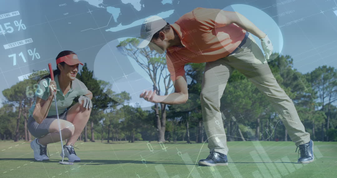 - Golfers Analyzing Swing with Digital Stats Overlay on Golf Course