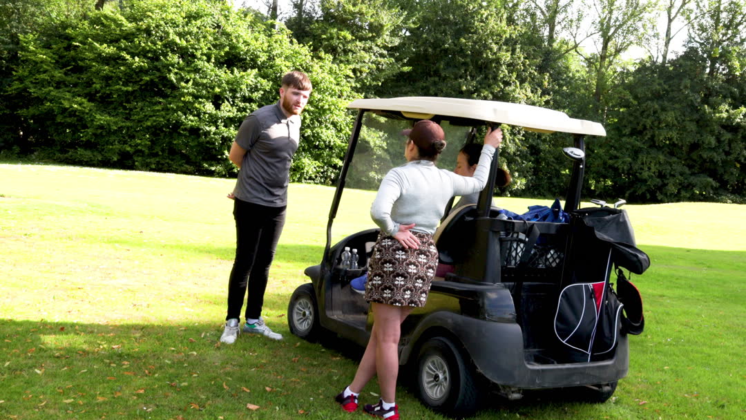 - Golfers Conversing at Golf Cart on Scenic Green Course