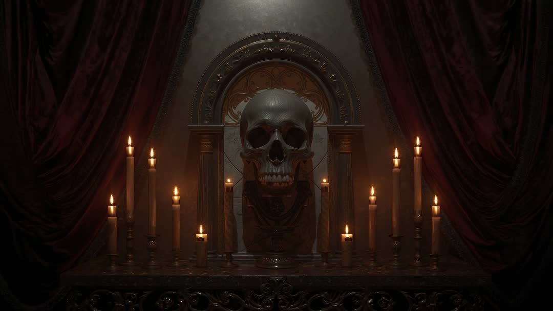 - Gothic Altar with Skull and Flickering Candlelight, Symbolic Ritual