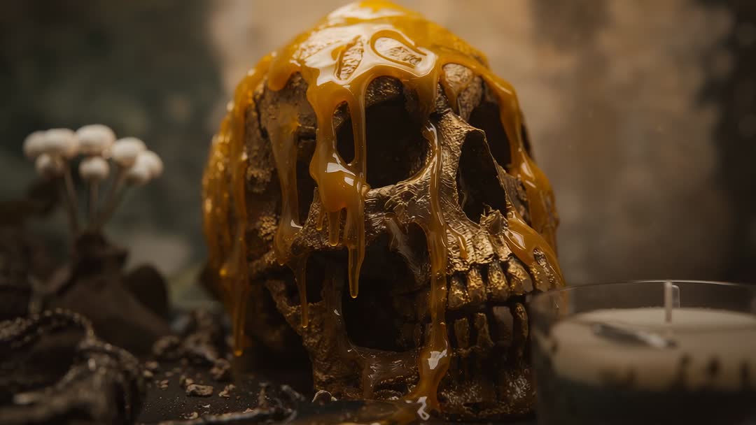 AI Generated Image. An enigmatic scene with molten amber wax eerily cascading over a detailed skull replica. This setting highlights gothic charm with ambient lighting and ethereal elements like dried stems and flickering candle. Perfect for content related to Halloween themes, gothic art inspiration, or mystical rituals.