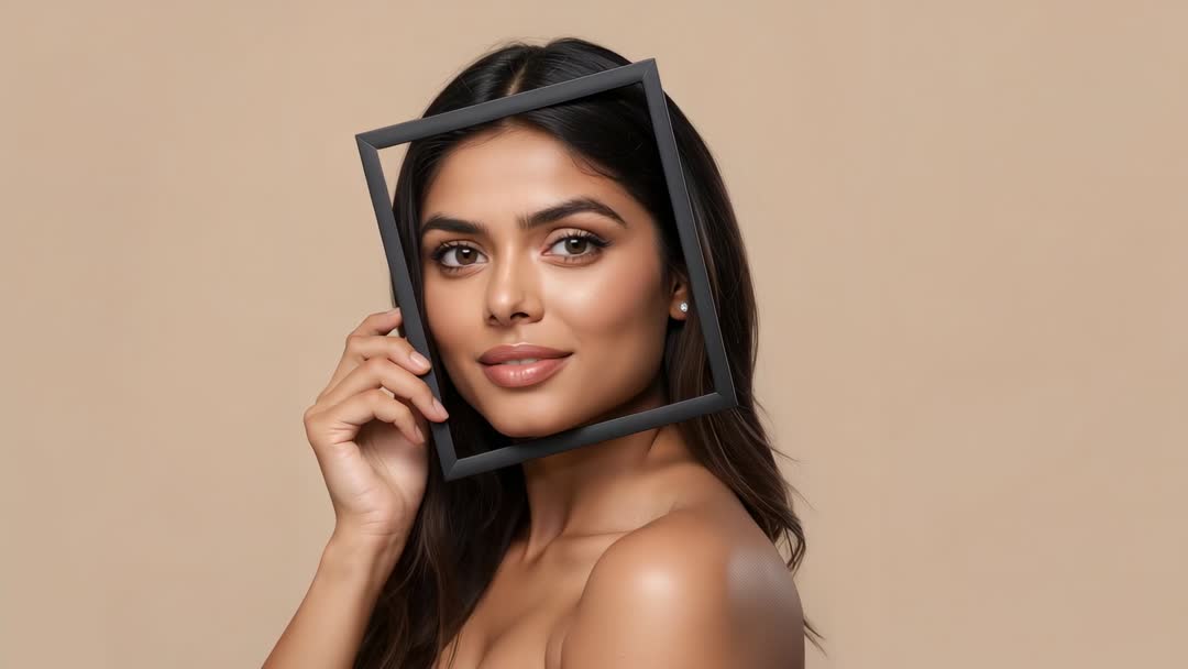 AI Generated Image. Model holding a black square frame along her jawline creates a chic and intriguing look. Her minimal makeup with a natural yet polished appearance radiates confidence, ideal for showcasing fashion, beauty products, or lifestyle blogs focused on elegance and simplicity. This composition emphasizes both restraint and sophistication, perfectly fitting modern branding campaigns.