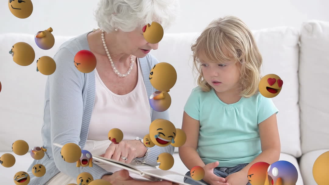 An elderly woman reading a book with her young granddaughter, surrounded by floating emojis, which provide a whimsical and colorful atmosphere. The interaction highlights the themes of family bonding, joy, and education in a playful setting. This cheerful videory can be used in promotions about storytelling, family activities, emotional well-being, or creative content pieces.