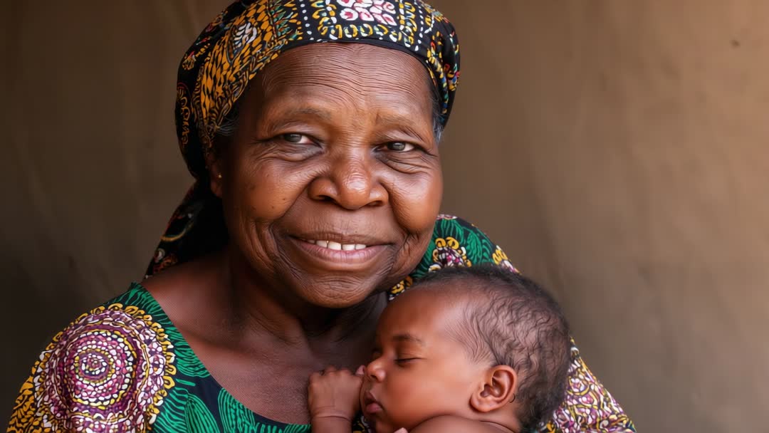 AI Generated Image. Video clip showing grandmother smiling while cradling sleeping infant against chest, wearing colorful patterned dress and headscarf. Gentle natural light and shallow depth of field creating warm, intimate atmosphere. Close-up composition focusing on facial expressions and tender gesture. Use for family and parenting campaigns, eldercare and healthcare outreach, non-profit storytelling, cultural heritage projects, community programs, greeting card and social media content, website hero banners, documentary sequences about family and aging, commercial spots featuring trust and care. Working well as loopable B-roll, background clip for interviews, or hero footage for ad spots. Pairing with soft ambient music and slow crossfade for emotional pacing; trimming to 5-10 seconds for social reels or using longer cuts for broadcast. Editing suggestions include emphasizing warm color grade, preserving natural skin tones, maintaining soft highlights, and cropping for square or vertical aspect ratios for mobile.