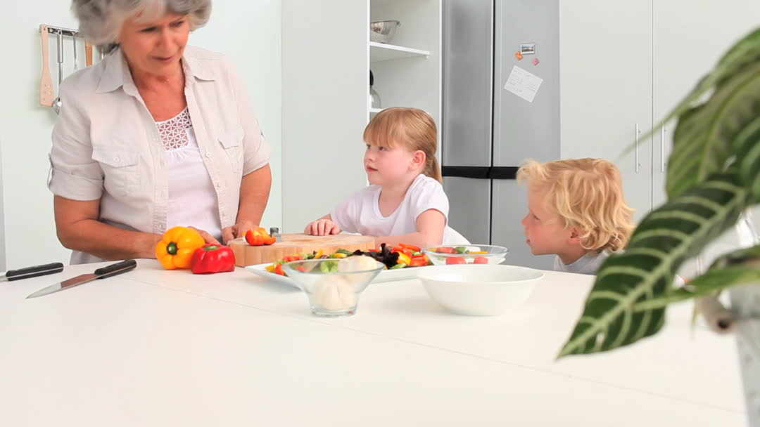 An elderly woman is actively engaging her grandchildren in the cooking process in a modern, well-lit kitchen. The children exhibit curiosity and enjoyment as they participate in the capping and potentially help assemble ingredients scattered on the table, like colorful peppers. This scene can be used in contexts highlighting family bonding, cooking tutorials, or advertisements featuring multi-generational settings. It illustrates skill-sharing, love, and the nurturing aspects of family relations through collaborative cooking activities.