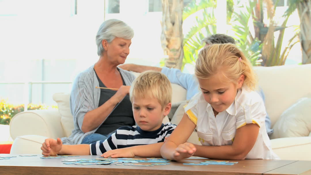 Grandparents Engaging with Children Solving Puzzle Indoors Video