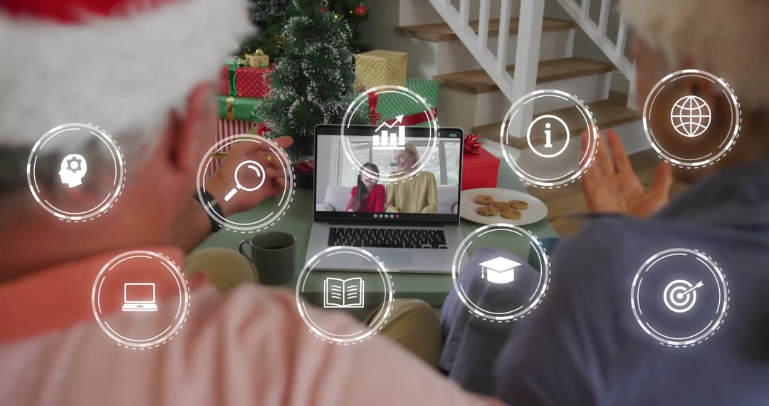 Video showing grandparents video calling family on laptop during holiday celebration, waving at grandchildren while digital icons for education, search, analytics, and global connectivity floating over scene. Warm living room featuring Christmas tree, wrapped gifts, cookies on table, creating multigenerational connection mood. Serving for holiday marketing, remote family communication campaigns, senior technology tutorials, online education promotion, telehealth outreach, greeting video content, corporate inclusion and community outreach, social media clips demonstrating digital connectivity. Offering edit-friendly composition with clear center laptop screen and foreground grandparents gestures, allowing overlaying of text, logos, subtitles and call-to-action elements.