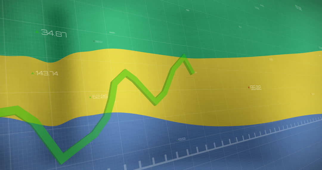 This visual highlights economic indicators with an animated graph overlaid on Gabon's flag. Useful for interpreting economic developments, financial reports, or presentations focused on Gabonese business trends.