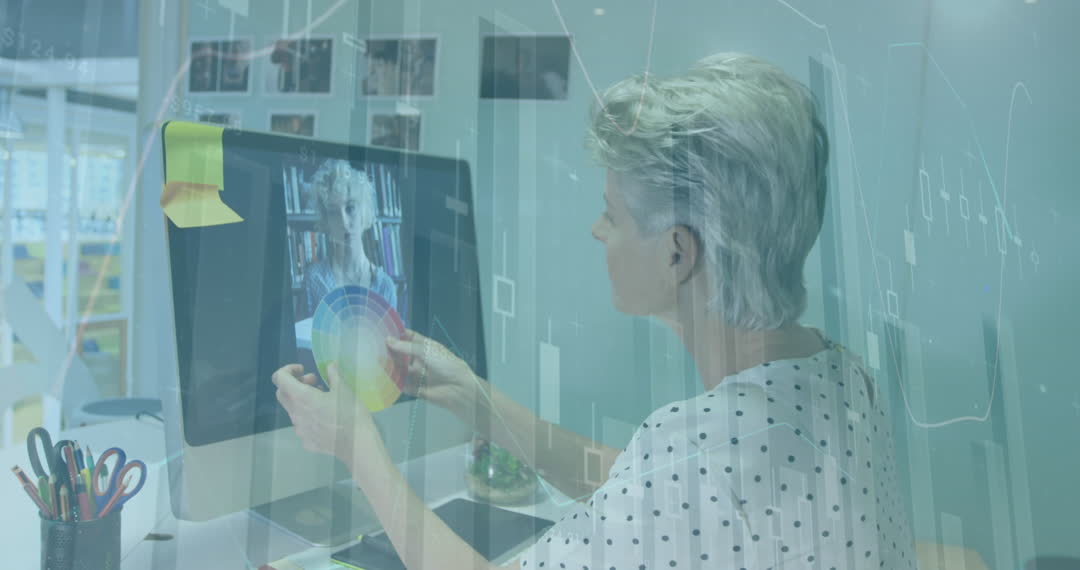 A female graphic designer sits at her desk engaging with a color palette pinned to her computer screen. Overlaid are digital data graphics symbolizing modern technology usage in creative processes. Useful for illustrating themes of creativity, graphic design, and the integration of technology in professional practices, ideal for marketing, technology blogs, and business presentations.