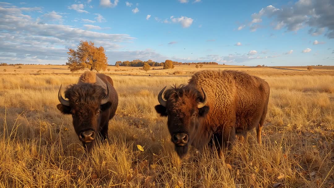 AI Generated Image. Showing two American bison grazing and lifting heads while stepping forward across sunlit golden prairie. Focusing on close foreground bison with rolling grassland and scattered trees receding into horizon under blue sky with soft clouds. Featuring warm amber light and falling yellow leaf adding autumn mood and sense of motion. Supporting narratives about wildlife behavior, prairie ecosystems, conservation messaging, ranching lifestyle, eco travel and nature education. Suiting wildlife documentaries, editorial features, environmental reports, tourism campaigns, website hero banners, social media storytelling, print posters and calendar layouts. Working well for wide crops and cinematic video sequences; suggesting color grading to enhance warm tones and contrast for golden hour mood.