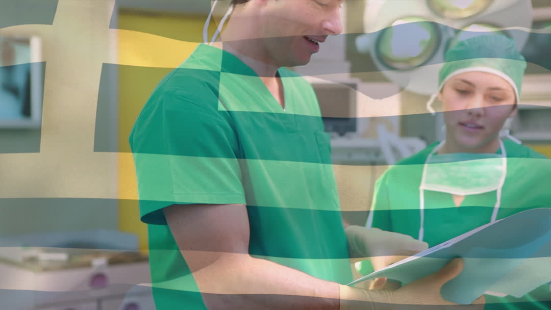 Doctors in hospital wearing green scrubs having a conversation. Greek flag overlays highlighting patriotism within the healthcare system. Ideal for content about healthcare in Greece, medical professional teamwork, national service in medicine, or promotional material for medical tourism.