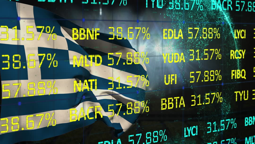 Flag of Greece set against a digital stock market display with economic data percent changes. Useful for topics related to Greece's economic situation, financial investments, or stock market analysis, highlighting global financial trends and economic strategies.