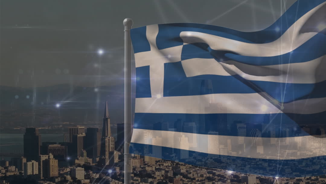 Animation showing Greek flag waving with a bustling city skyline and digital network connections suggests rapid technological advancement. Use for concepts in globalization, technological development in Greece, or international relations, capturing the interplay of tradition and innovation.