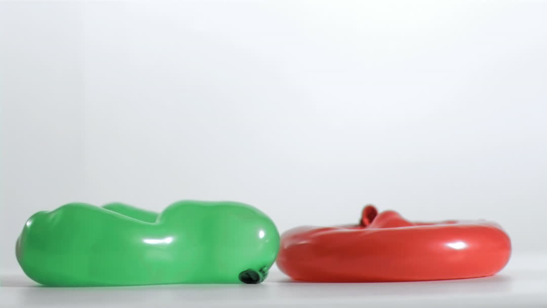 Two balloons, one green and one red, are captured while bouncing on a white surface in slow motion. The video showcases the dynamic flexibility and vibrant colors of the inflatables, creating a playful and lively visual. Ideal for use in designs centered on play, movement, and children's activities, as well as for educational materials on physics and air resistance.
