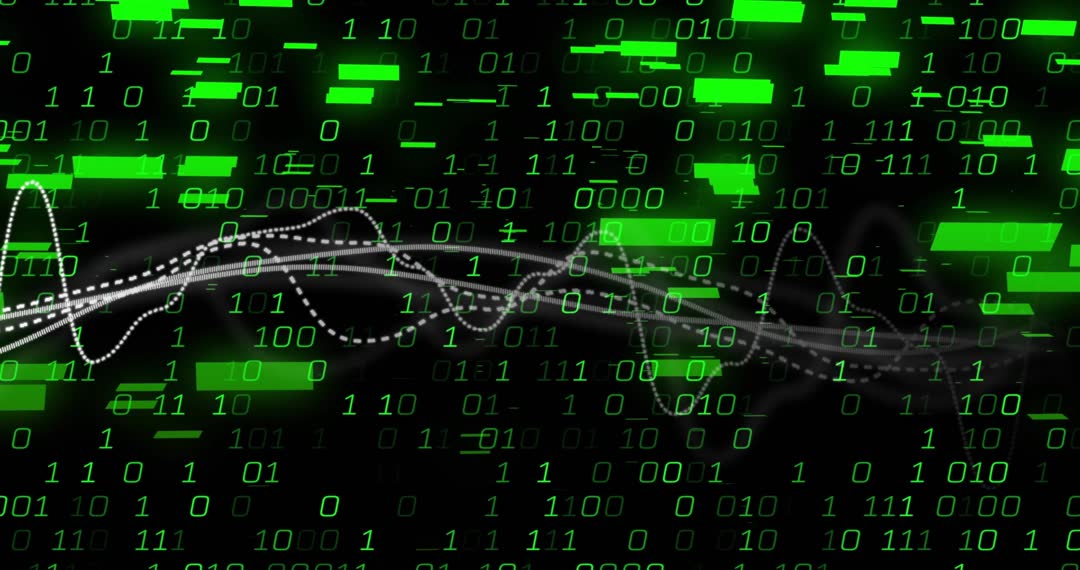 Video showing green binary digits cascading across dark field while dotted waveform lines flowing through center, creating sense of network data stream and system overload. High-contrast green bars and glitch elements punctuating code rain, conveying cyber threat, data analytics, and digital communication themes. Suited for cybersecurity presentations, IT product demos, technology news segments, web hero backgrounds, and marketing for software or fintech. Working well as loopable background for title animations, motion graphics overlays, or lower thirds. Editable for color grading, speed ramping, or chroma blending to match brand. Delivering modern, high-tech mood for explaining data flow, network monitoring, breach alerts, or abstract tech concepts.