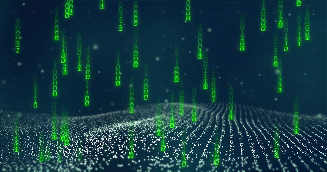 - Green Binary Rain Falling Over Particle Grid While Digital Data Waves Flowing