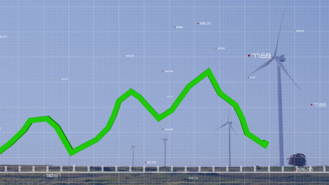 Visualization shows data analytics through green graph overlay on wind farm background, highlighting intersection of technology and renewable energy. Useful for presentations on sustainability, green tech innovation, or energy industry trends.