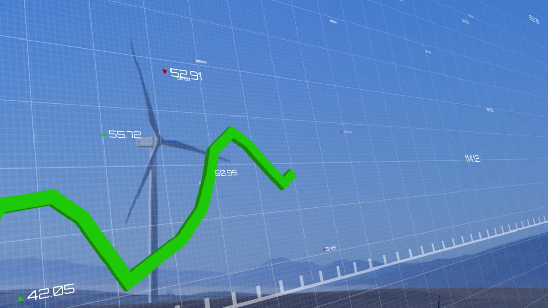 Stylized illustration featuring a wind turbine overlapped with move of data line graph signifying the relation between environmental technology usage and analytical data metrics. This is suitable for usage in content discussing renewable resources, environmental data science, reporting progress and impact assessment in sustainability criteria in businesses and governments.