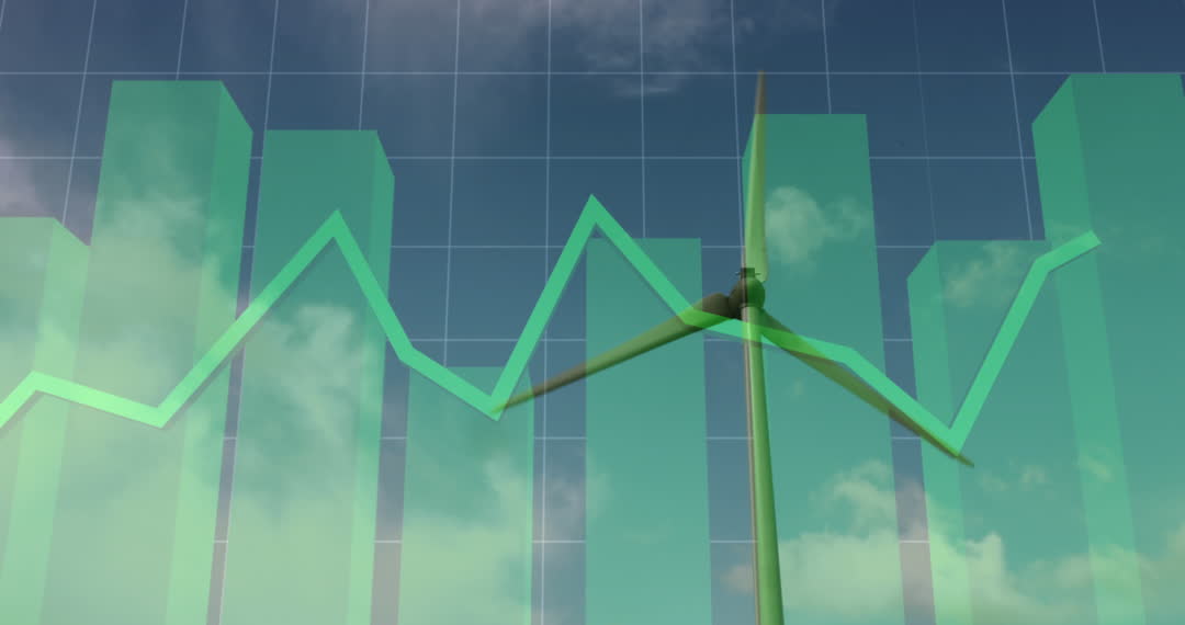 Conceptual visualization fusing green energy and financial data, illustrating connection between renewable initiatives and market trends. Ideal for presentations on sustainable investments, as well as reports on economic impacts and benefits of energy transition.