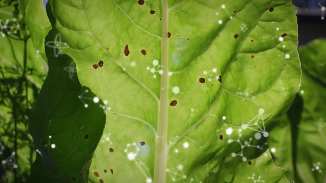 Large green leaf adorned with scattered brown spots and overlaid with animated glowing molecular structures. This digitally enhanced video blends nature with science, highlighting the connection between biology and technology. Useful for educational content about botany, environmental science, and digital art exploration, or as a creative backdrop for scientific presentations.