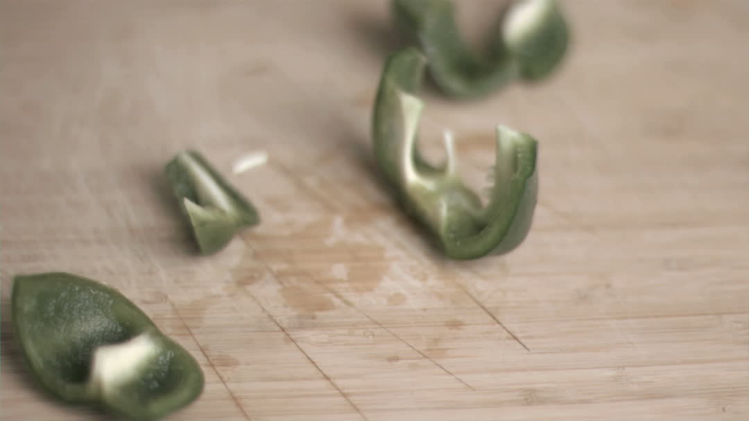 - Green Pepper Slices Falling on Cutting Board in Slow Motion