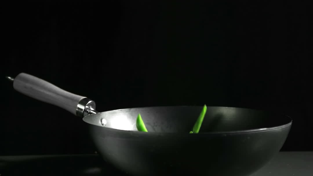 Dynamic videory of sliced green peppers dropping into a hot wok against a black backdrop. Useful for demonstrating cooking techniques or promoting culinary classes and kitchenware products. Great addition for food blogs or recipes requiring fresh vegetables in vibrant action shots.