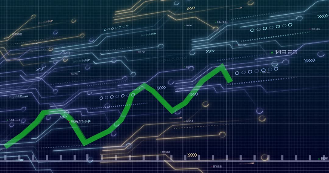 This visual captures a technology-driven data visualization with a green polyline set against a digital dashboard. The dynamic line traversing the grid pattern suggests trends and analytics interpretation, commonly used in financial market reporting or business analysis projects. Ideal for use in presentations related to technology, data analytics, financial forecasting, and digital innovation.