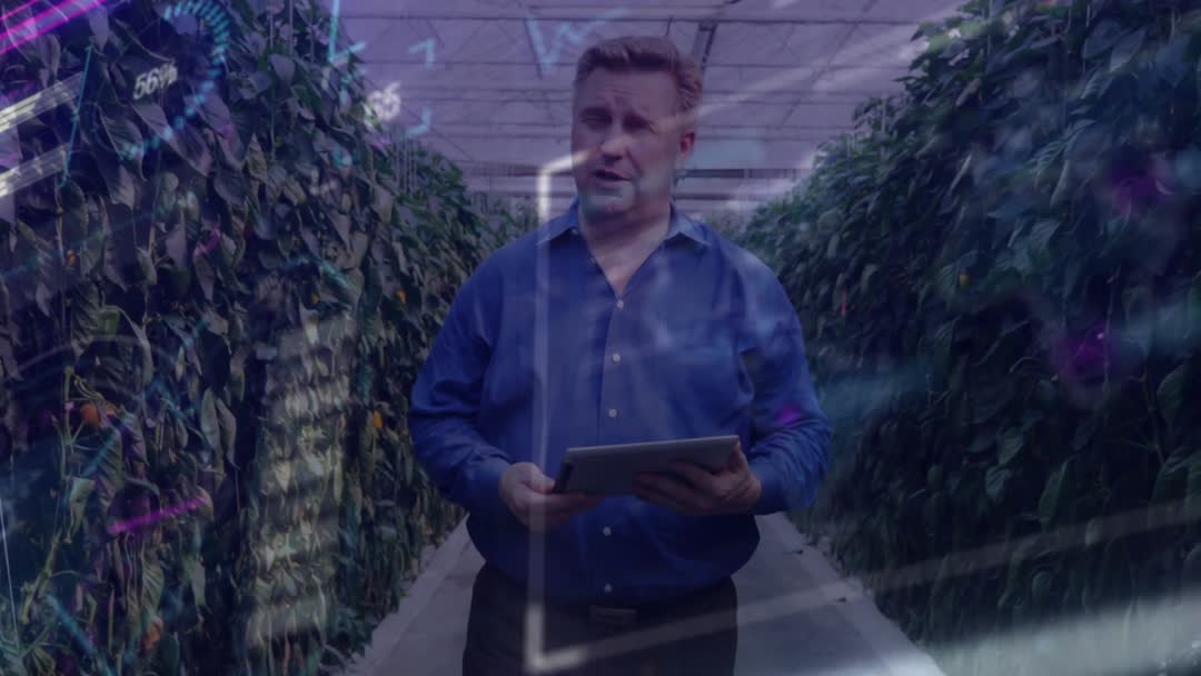 The scene depicts a greenhouse manager walking along a corridor lined with plants. He holds a tablet that projects plant health metrics as an overlay, showcasing the integration of technology and agriculture for optimal plant care. This video illustrates modern approaches to horticulture through the use of analytics, offering valuable insights into how the agricultural sector continuously adapts using innovative technology. Suitable for use in discussions about sustainable farming, agricultural innovations, or digital transformation in traditional industries.