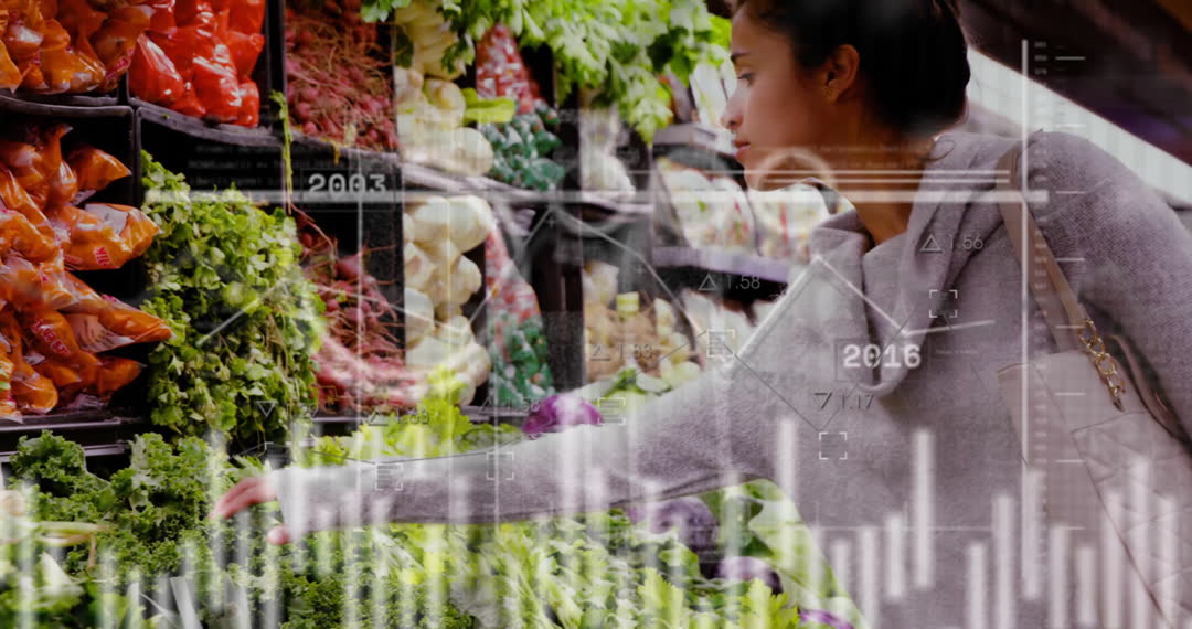 The video showcases a woman selecting fresh produce in a grocery store combined with digital graphs and financial data overlays. It represents the intersection of shopping habits and financial data analysis. This visual might be used in articles or presentations related to consumer behavior studies, financial trends in commerce, or the integration of technology in retail industries.