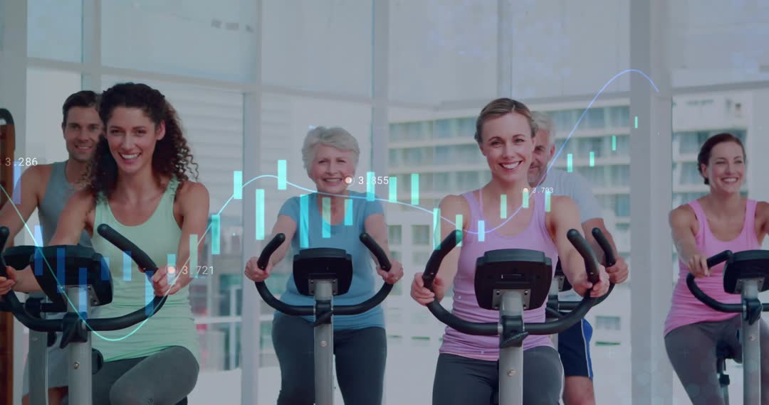 A diverse group cycles indoors on stationary bikes. Data graphics overlay shows progressive performance data. Ideal for fitness center promotions, articles on innovative health-tech applications, or motivational wellness posters.