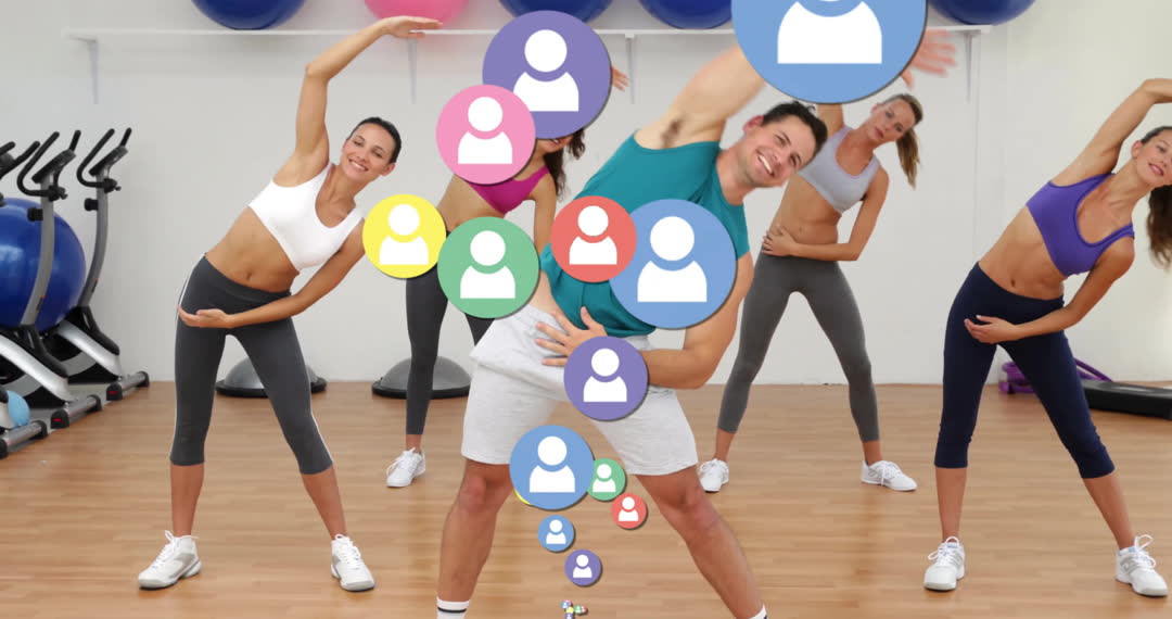 Group of individuals exercising in a gym while animated social media icons overlay scene, highlighting blend of fitness and digital networking. Suitable for illustrating modern fitness culture, impacts of technology on health routines. Great for content related to fitness apps, online communities, health seminars, technology in fitness industry.