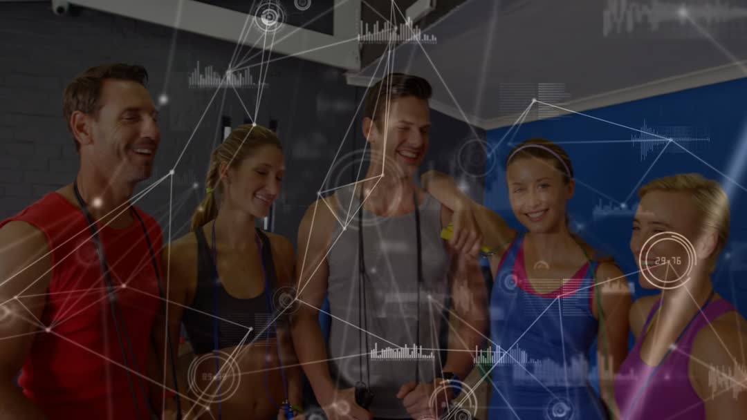 Video showing group of five athletes in fitness studio holding jump ropes while wearable-data overlays tracking heart rate, jump count, and performance analytics. Camera capturing smiling faces, coach guiding group, energetic camaraderie, modern gym environment. Overlay graphics conveying connected fitness, real-time metrics, digital coaching, and IoT health tech integration. Usage suggestions: Use for fitness app promotions, wearable technology campaigns, gym class advertising, corporate wellness programs, training tutorial videos, social media fitness content, presentation slides about sports analytics. Edit for hero banners, app onboarding sequences, product explainer videos. Apply color grading and overlay emphasis to highlight data graphics and futuristic tech feel.