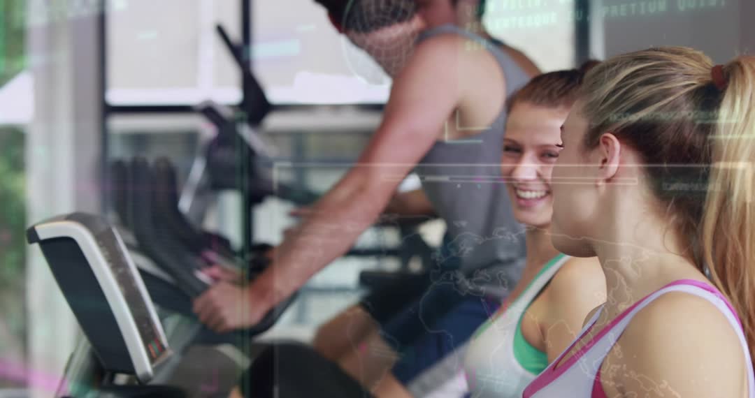 Young adults engaging in cardio workout at vibrant urban gym. Image captures camaraderie and determination as they cycle on stationary bikes positioned near windows, providing an energetic and modern atmosphere. Adds a relatable human element to health and fitness materials. Suitable for use in promotional content for gyms, workout apps, and lifestyle blogs emphasizing healthy living and community engagement.