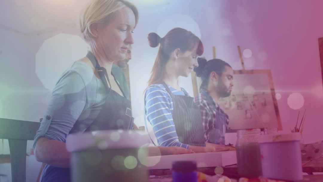 People engaged in artistic activities create a dynamic ambiance in art studio enhanced by floating light effects that add a dream-like atmosphere. Ideal for concepts about teamwork, workshops, and creativity.
