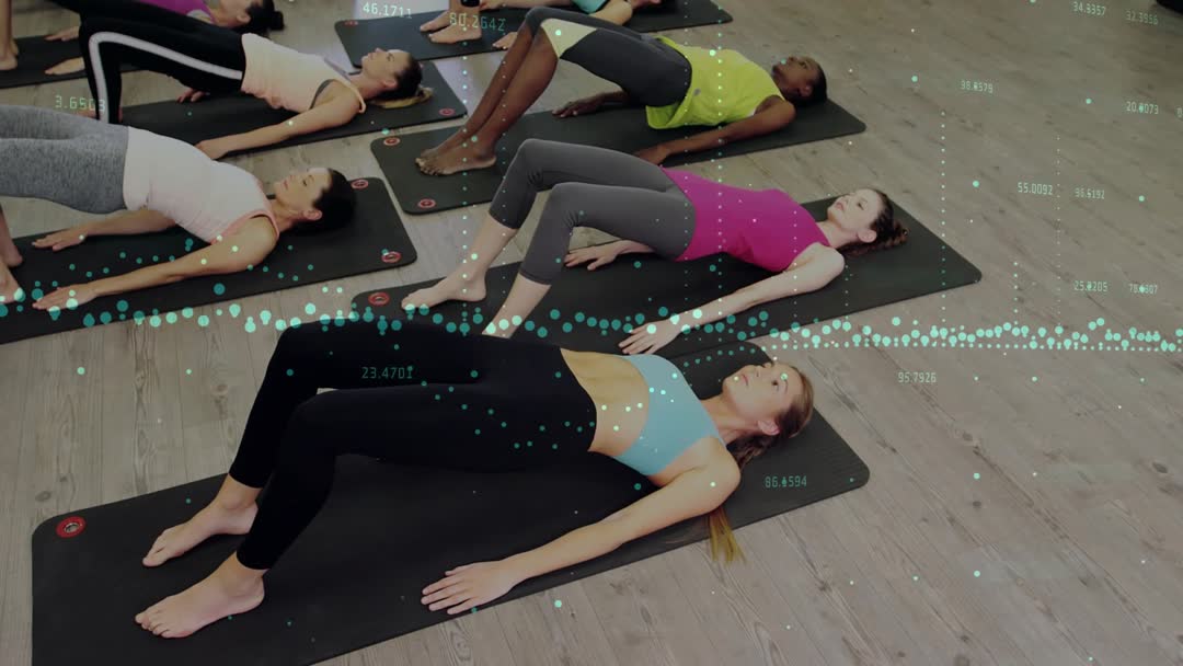 Showing group of women performing synchronized bridge exercise on mats while digital biometric waveform maps movement and intensity. Featuring wearable tech data points and numeric overlays communicating real-time tracking for each lift. Suiting fitness app promos, wearable device demos, gym and studio marketing, online workout tutorials, and influencer content. Advising edit options including close-up crops on hips and mats, overlay color adjustments to match brand palette, slow-motion segments for emphasis, and looping for short social clips.