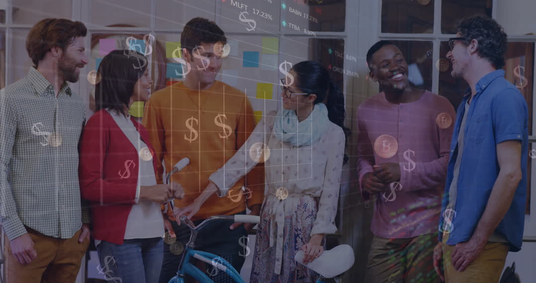 Young adults from diverse backgrounds engaging in friendly conversation, wearing casual attire, with digital currency and stock graphics overlay. Suitable for concepts about teamwork, startup culture, diversity in workplace, or financial trends in a modern office setting.