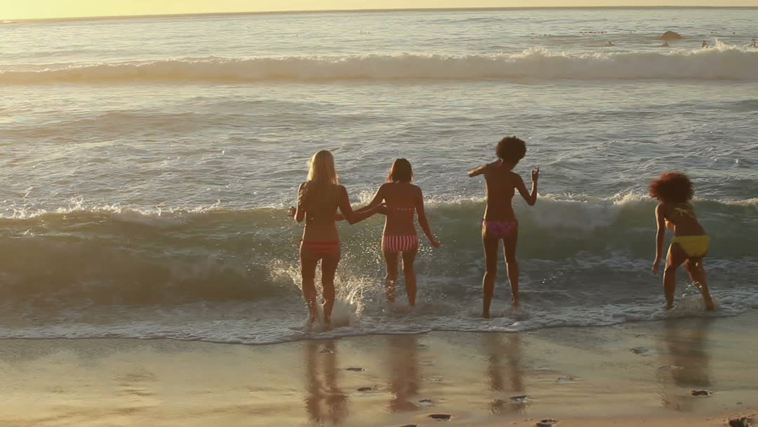 Four friends running towards sea waves at sunset, showcasing camaraderie and fun on the beach. Perfect for use in ads promoting vacations, summer activities, beach events, friendship themes, and travel experiences.