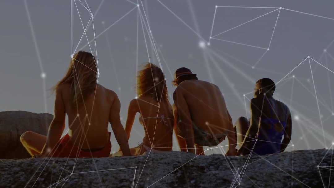 A group of friends relaxing on rocks, watching the sunset at the beach while an abstract digital network gui overlays their setting, suggesting a fusion of nature and digital innovation. Great for promoting leisure travel with tech themes, uses in adventure banners or highlighting modern social connections.