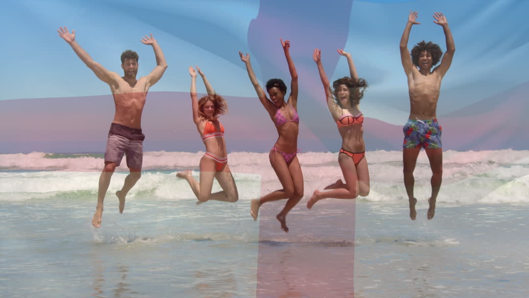 - Group of Friends Jumping on Beach with Patriotic Filter Overlay