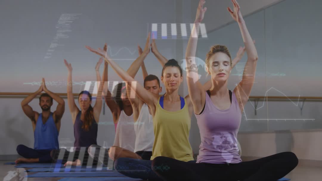 Showing mixed group of adults practicing guided yoga and meditation on mats, lifting arms into prayer pose with eyes closed and calm expressions. Featuring translucent charts and biometric overlays animating across frame, suggesting wearable analytics, health tracking, or biofeedback integration. Capturing synchronized movement, steady breathing, and cross-legged posture in contemporary studio with barre and mirrored wall. Ideal for wellness app promo, wearable health device commercial, corporate wellbeing program, online meditation course, fitness brand campaign, data-driven healthcare presentation, social media mindfulness content, and lifestyle blog hero. Suggesting editing ideas: adding guided voiceover and ambient music, inserting lower third copy or logo, timing cuts to breathing rhythm, using close-ups for emotional connection, and color grading to match brand mood.