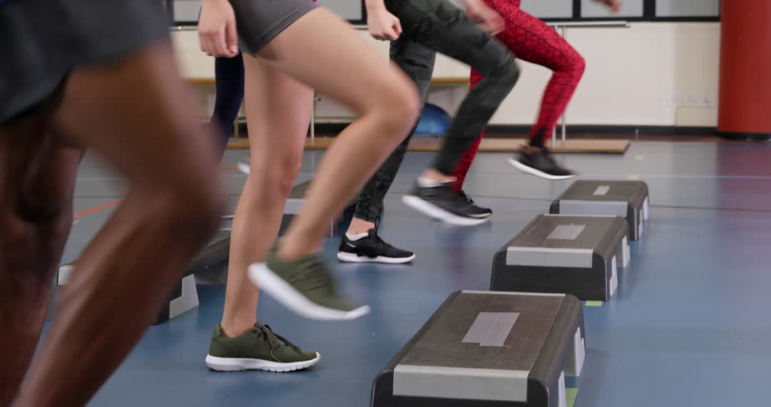 - Group Stepping Aerobics in Modern Gym Class