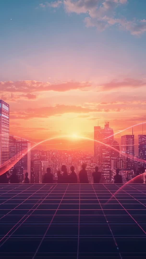AI Generated Image. Showing group of silhouettes watching futuristic city sunset from rooftop grid as neon arcs sweep across skyline. Featuring warm sunset tones and cool neon highlights creating cinematic contrast and futuristic mood. Offering vertical framing with strong foreground grid leading eye toward glowing horizon. Serving social media reels, mobile ads, app intros, event promos, and technology or urban lifestyle campaigns. Pairing with motivational copy, startup pitches, and network connectivity themes to enhance messages of innovation and collaboration. Recommended edits: applying gentle slow pan or parallax, adding subtle lens flare and text overlay in top and middle safe zones, reserving lower grid area for logo or call to action. Conveying mood of optimism, progress, and city energy at dusk.