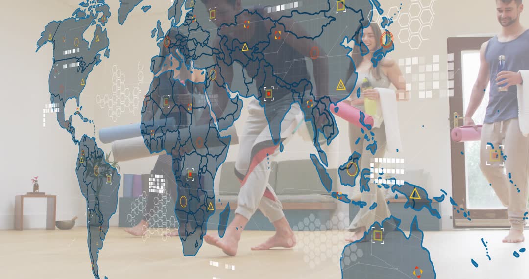 People engaging in a group yoga practice transitioning into a space with yoga mats, overlaid with a world map illustration. This visualization highlights the connection between wellness and global unity, emphasizing the shared journey towards health and fitness. Ideal for use in health and wellness promotions, worldwide gym network ads, and lifestyle blogs focusing on global fitness communities.