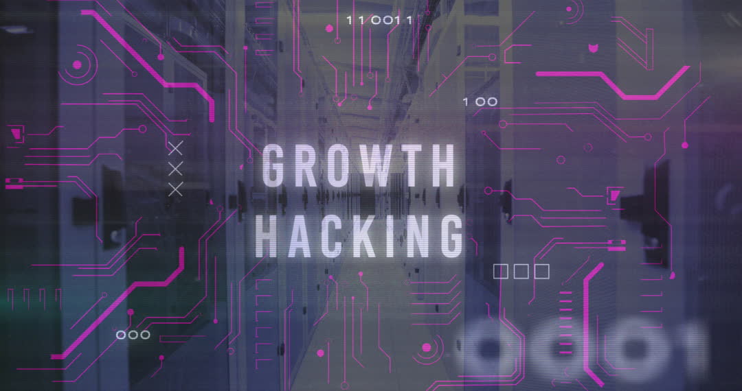 - Growth Hacking Text with Circuit Board and Binary in Server Room