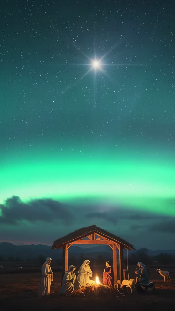 AI Generated Image. Portraying nativity scene under bright guiding star and vivid aurora borealis, vertical video featuring holy family gathered around manger, kneeling shepherds, and warm firelight glow against starry night sky. Providing tall composition optimized for mobile devices and social reels, offering cinematic color palette and dramatic contrast between celestial greens and warm foreground tones. Evoking reverence and holiday wonder through combination of celestial phenomena and humble stable tableau. Ideal for holiday campaign backgrounds, church sermon visuals, seasonal greeting videos, Christmas adverts, social media reels, and educational presentations about Christmas traditions. Pairing well with inspirational music, scripture overlays, or carol lyrics for intros, title sequences, and closing shots. Offering space for lower-third text and vertical captioning, and supporting simple color grading for cohesive branding. Licensing suitable for commercial and editorial use in festive marketing, religious outreach, and seasonal storytelling.
