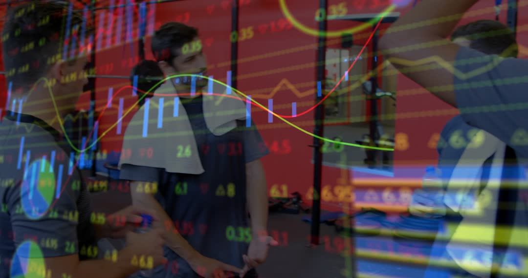 - Gym Team Conversing Post-Workout While Live Market Data and Financial Charts Overlaying Scene