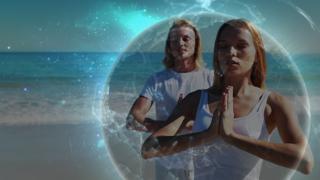 Individuals practicing meditation on a serene beach with a digital globe animation overlay. Represents harmony, mindfulness, and unity with nature. Perfect for use in wellness, yoga, meditation retreats, and holistic lifestyle themes.