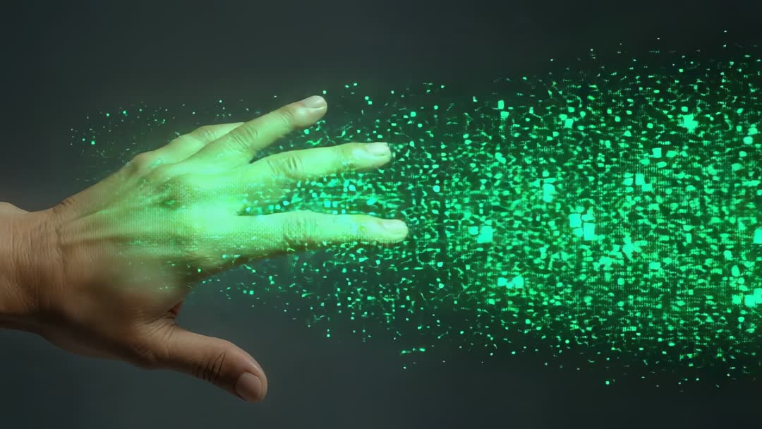 AI Generated Image. Showcasing adult hand emitting neon green pixelated particles that expand into dense data stream across dark studio backdrop. Featuring strong silhouette and forearm detail with high-contrast neon glow for dramatic futuristic mood. Serving technology brands, AI startups, cybersecurity teams, UX/UI demos, sci-fi trailers, and gaming intros needing dynamic digital energy visuals. Providing ample negative space for titles, lower thirds, and on-screen graphics; working well as looping background or extended motion clip. Suggesting color grade to match brand palette, composite with HUD or interface overlays, and apply slow-motion or speed ramping to emphasize particle dispersion. Delivering versatile asset for marketing, presentations, website hero sections, social media ads, and explainer videos about digital transformation.