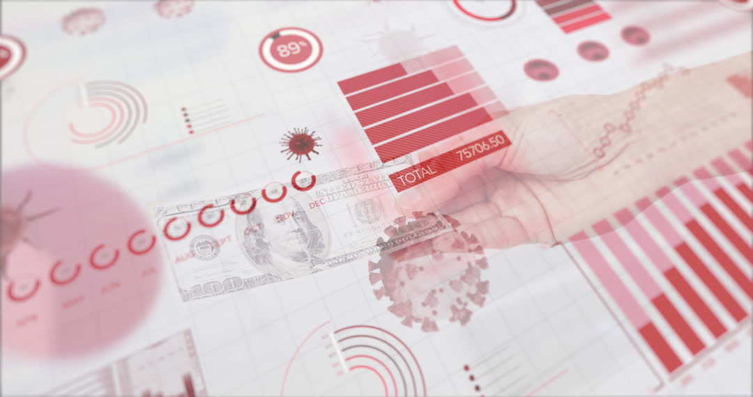 This conceptual animation portrays the relationship between economic impact and data surrounding the COVID-19 pandemic. Features a hand holding money overlayed with bar graphs and circular graphs representing statistics. Useful for presentations on pandemic economic impacts, financial reports, or analytical blogs.