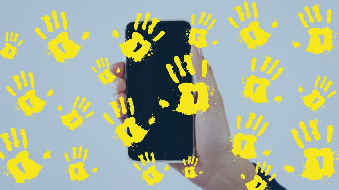Hand Holding Smartphone with Vibrant Yellow Handprints Video